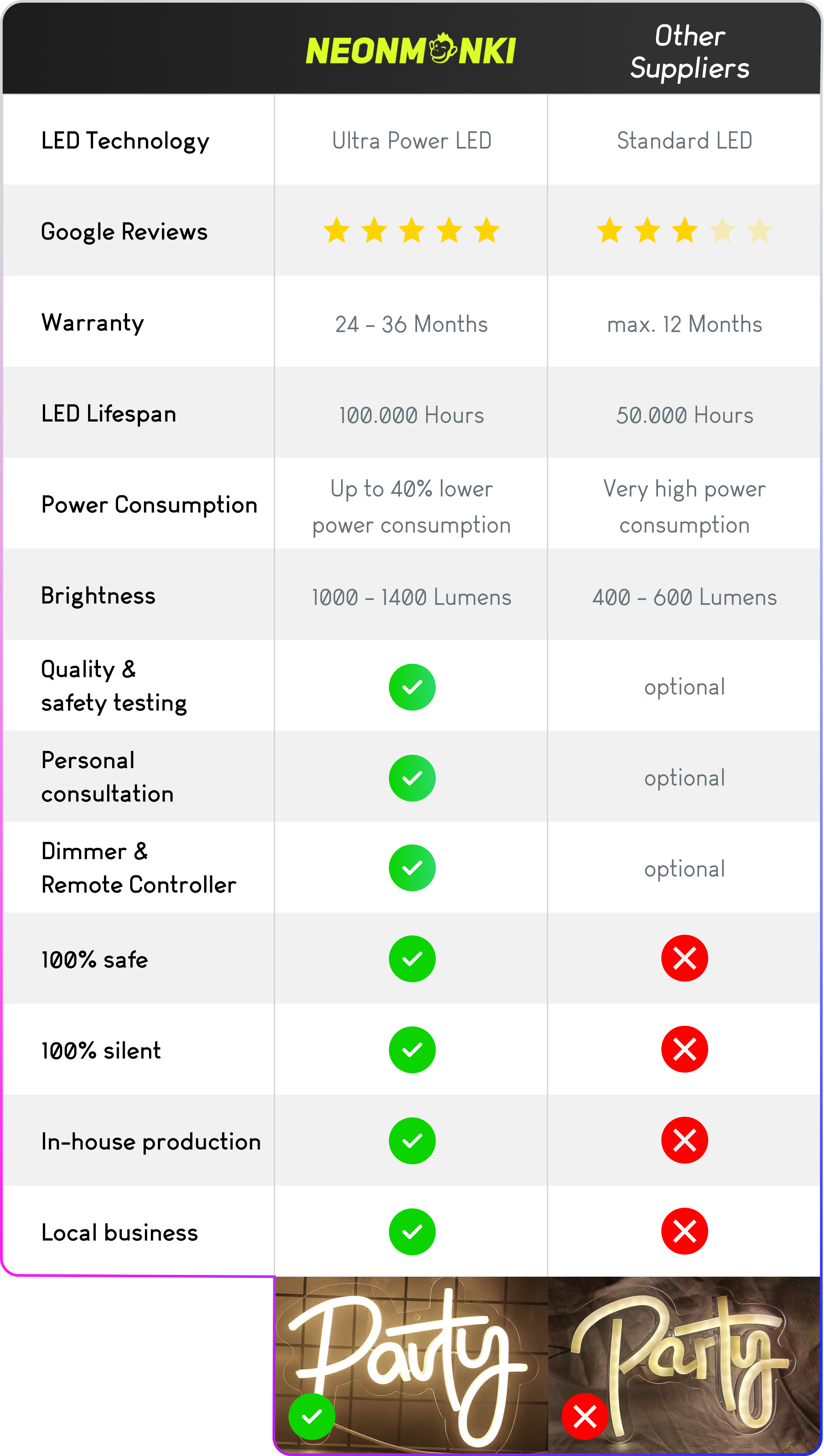 Wij bieden hoge kwaliteit, snelle service, persoonlijk advies en 36 maanden garantie op elk neonbord.